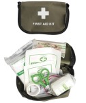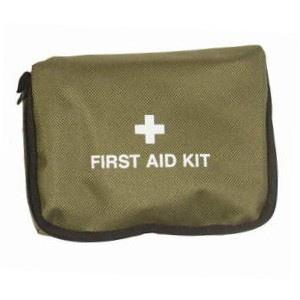 Turystyczny zestaw pierwszej pomocy zapakowany w torebkę w kolorze oliwkowym.