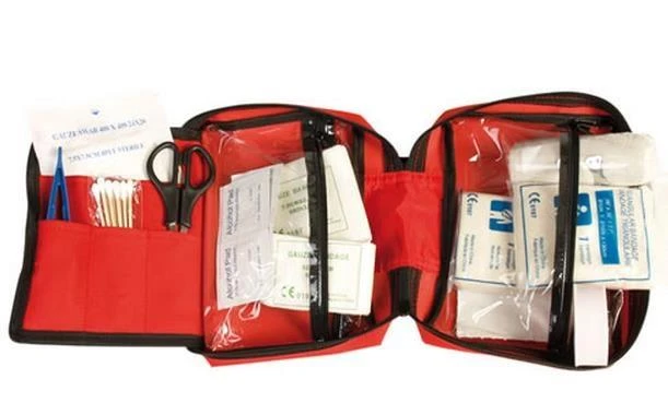 Turystyczny zestaw pierwszej pomocy zapakowany w torebkę w kolorze czerwonym.