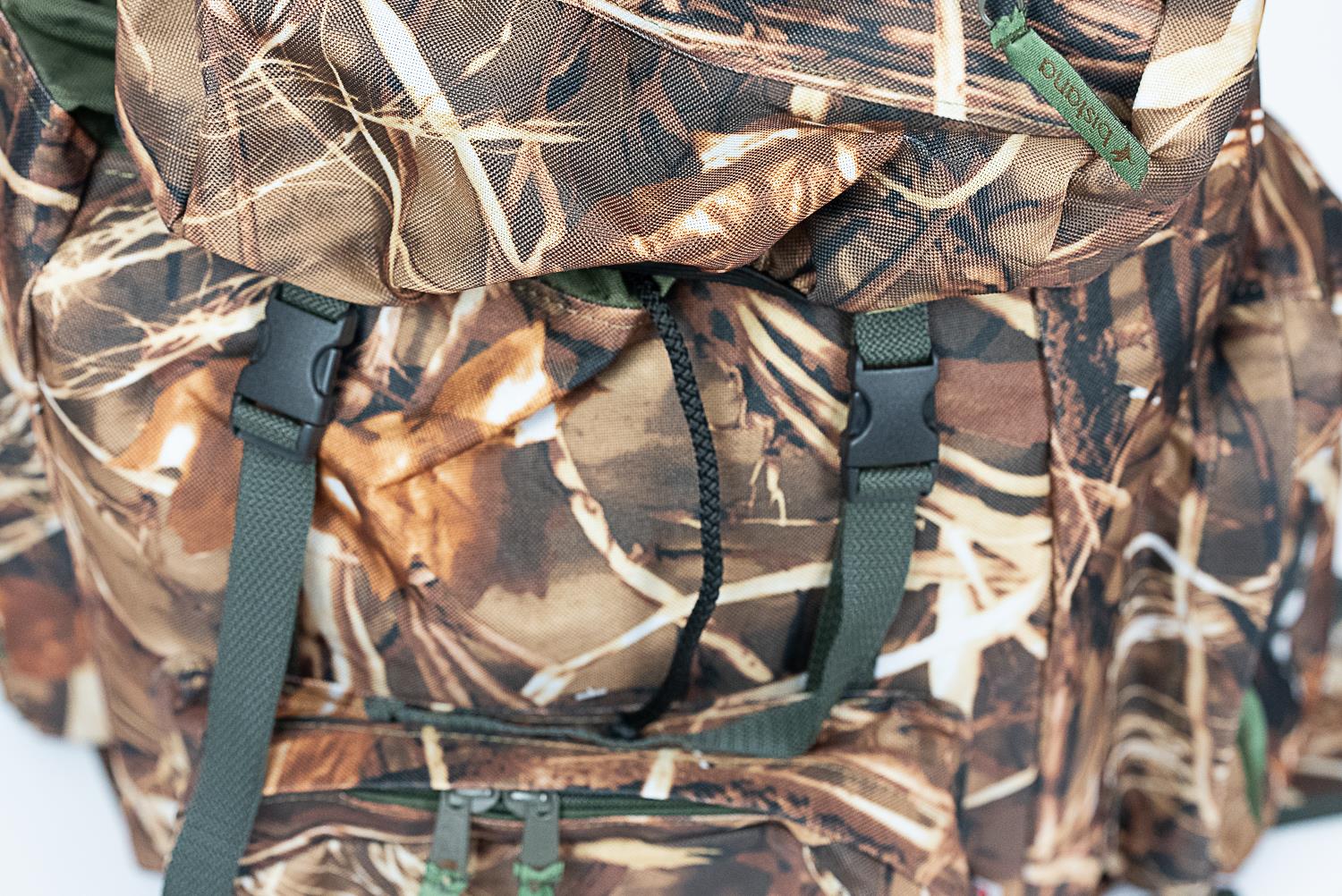 Plecak myśliwski we wzorze imitującym naturalne trzciny, liście i gałęzie. Górna klapa plecaka zapinana jest na klamry.