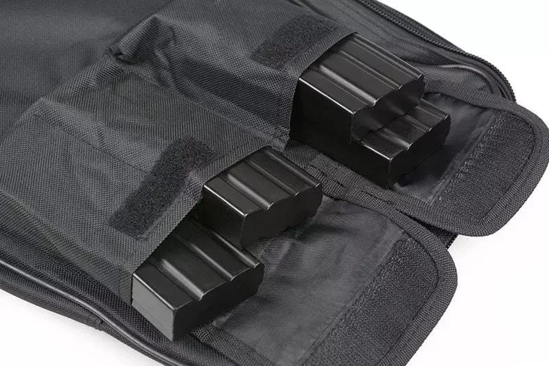 - Pokrowiec został wyposażony w zewnętrzne kieszenie, które umożliwiają przechowywanie magazynków i innych akcesoriów strzeleckich.