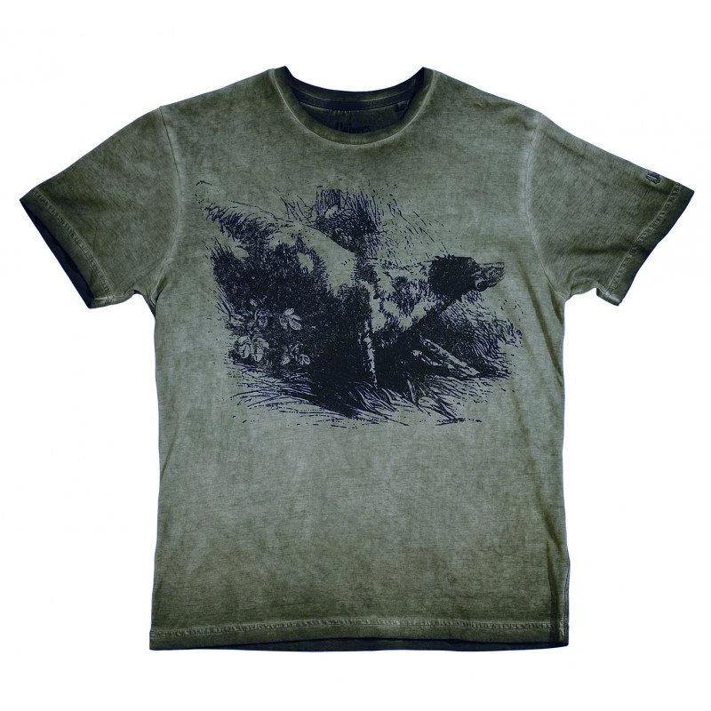Z przodu koszulki nadrukowano psa myśliwskiego.