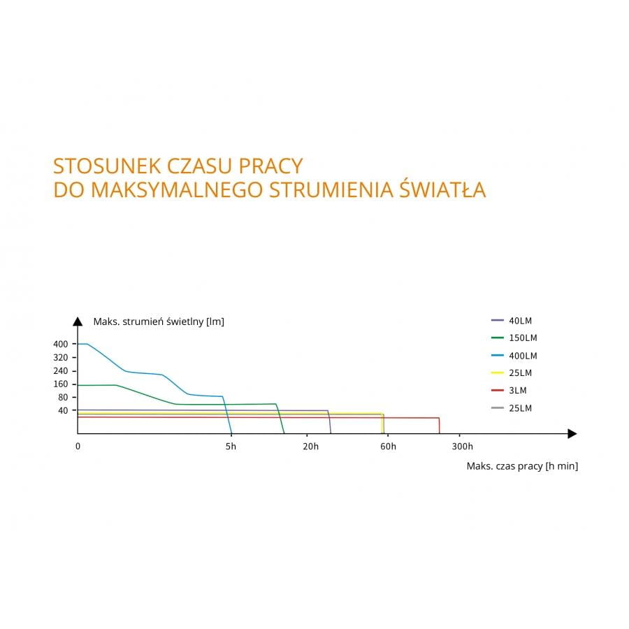 Światło białe - jego maksymalna moc to aż 400 lumenów którymi jest w stanie Świecic do nawet 5 godzin.