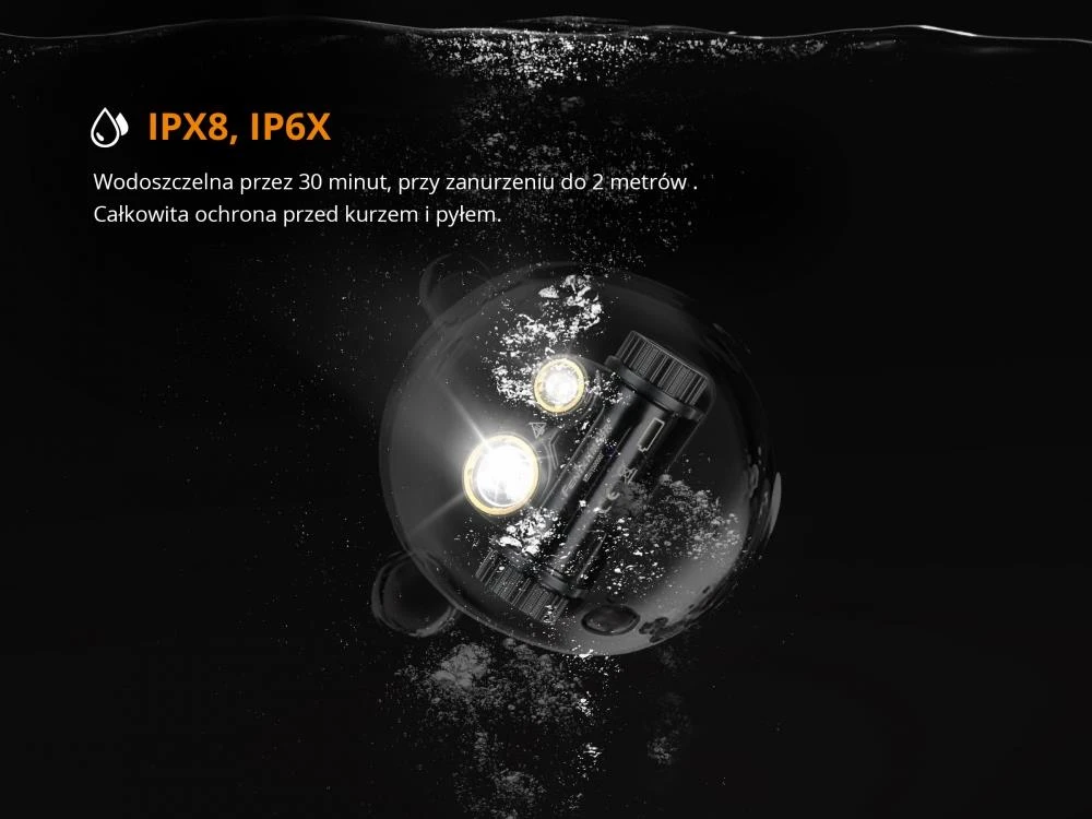 Dodatkowe funkcje i zabezpieczenia w czołówce Fenix HM65R: - zabezpieczenie przed odwróconą polaryzacją, chroniące przed nieprawidłową instalacją baterii.