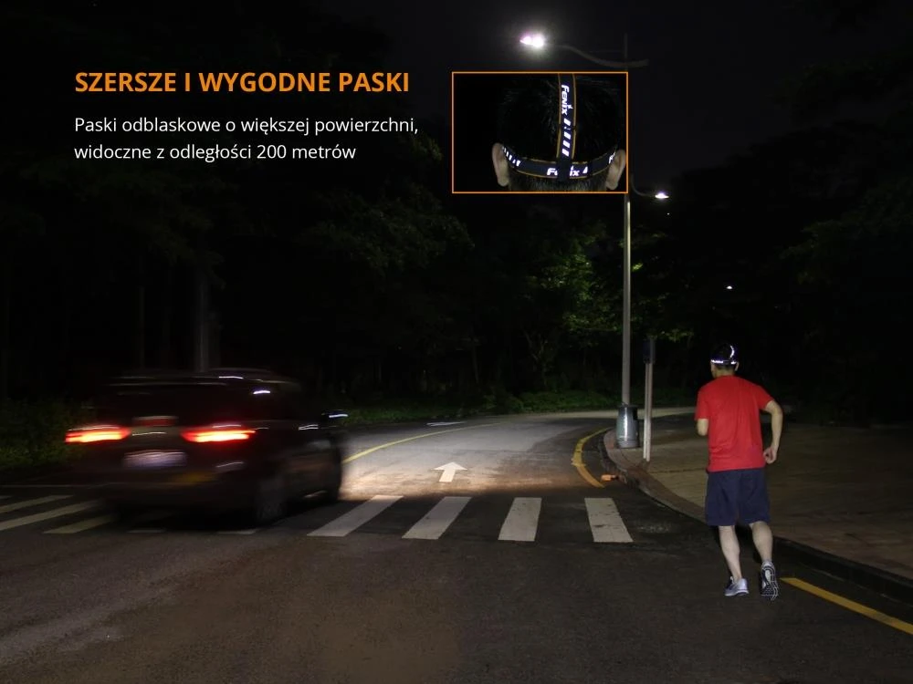 - Zmodernizowana opaska gumowa, odprowadzająca pot oraz wyposażona w odblaskowe wstawki zwiększające naszą widoczność i bezpieczeństwo podczas poruszania się nocą po drodze lub szlaku.