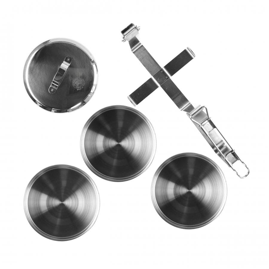 Garnki są ze sobą łączone za pomocą specjalnego uchwytu transportowego, który utrzymuje całość w stabilnej pozycji podczas przenoszenia.