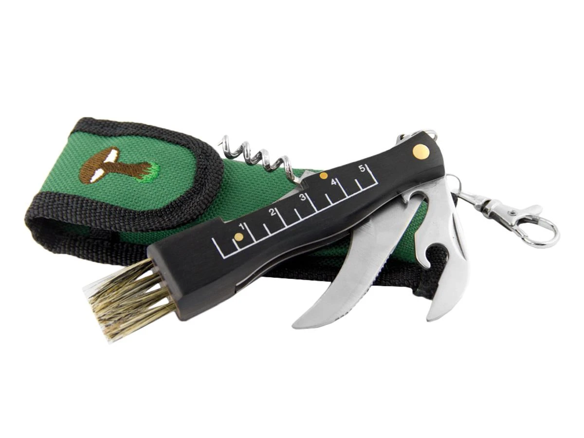 Nóż hiszpańskiej marki JOKERznanej na całym świecie ze swoich doskonałych wyrobów. est to składany nóż przeznaczony do zbierania grzybów. Specjalnie zakrzywione ostrze typu Warncliff (ułatwia przycinanie grzybów) wykonane jest z mocnej stali nierdzewnej. Rękojeść wykonana jest z wytrzymałego drewna, na którym znajduje się miarka umożliwiająca ustalenie średnicy grzyba. Na końcu rękojeści znajduje się miotełka umożliwiająca czyszczenie grzybów. Dzięki dołączonemu karabińczykowi można przypiąć go np. do paska. Dodatkowo model ten wyposażony jest w otwieracz do puszek i butelek, pęsetę oraz w korkociąg. W komplecie pokrowiec z kordury z możliwością przypięcia do pasa. Całość zapakowana jest w ładne tekturowe pudełko co sprawia że nóż idealnie nadaje się na prezent.