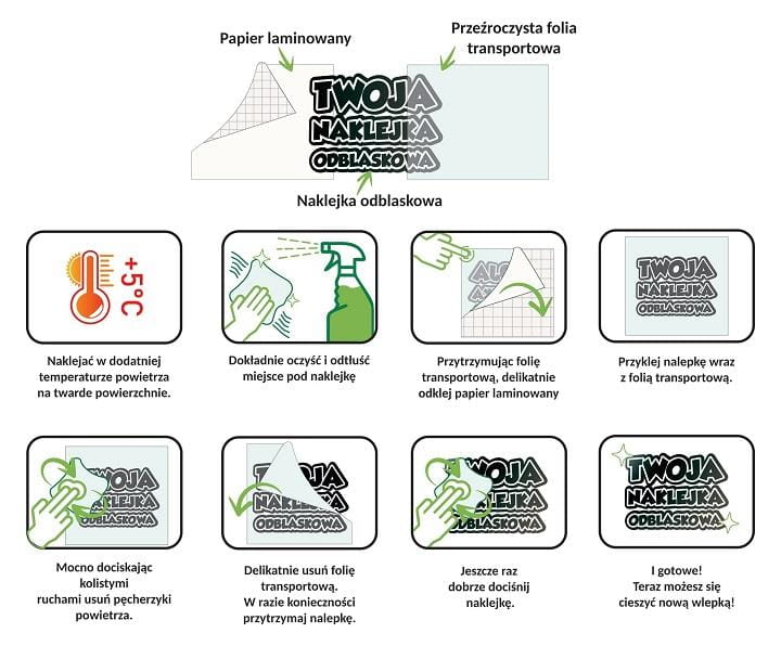 - dla najwyższej trwałości odtłuść podłoże przecierając je czystą ściereczką z odtłuszczaczem lub spirytusem (upewnij się że nie zaszkodzi to podłożu)