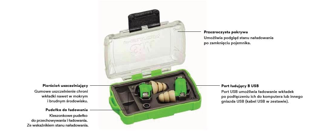 W komplecie znajduję się polimerowe popudełko ochronne, służące do bezpiecznego przenoszenia oraz ładowania wkładek (funkcja stacji dokującej). Ochronniki i pojemnik są odporne na warunki atmosferyczne (klasa IP54), dzięki czemu mogą być bezpiecznie używane podczas deszczu oraz wilgotnym środowisku.