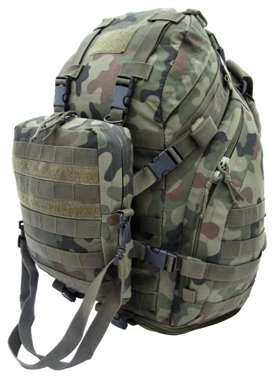Duży plecak taktyczny Molle model OVERLOAD wyprodukowany przez firmę CAMO M.G. Małą torbę można wypiąć i nosić osobno, jako chlebak. W plecaku zastosowano specjalny otwór na wyście rurki systemu hydracyjnego.