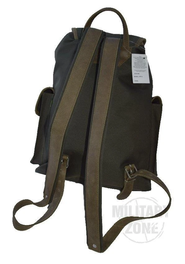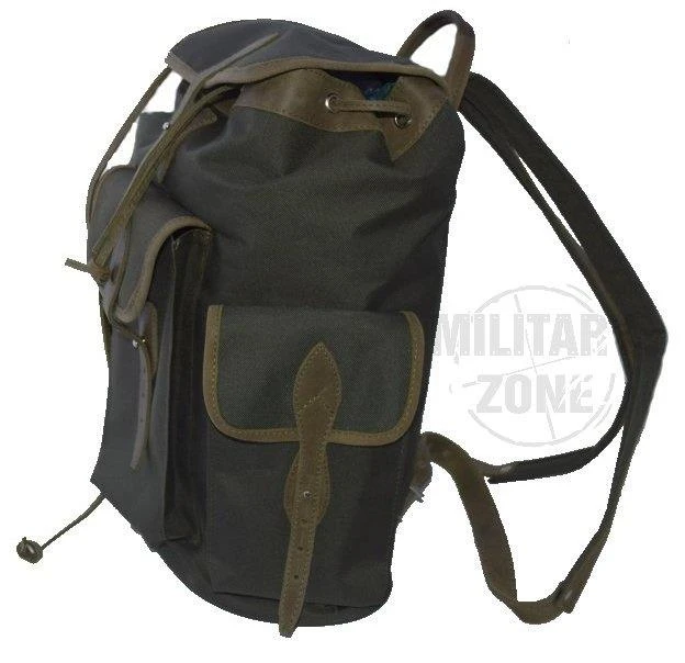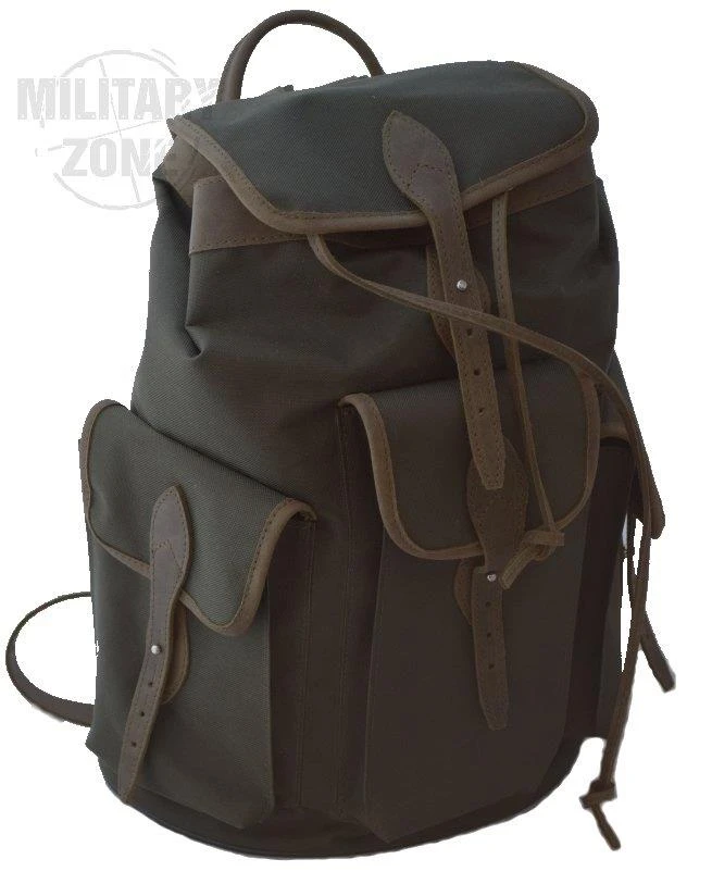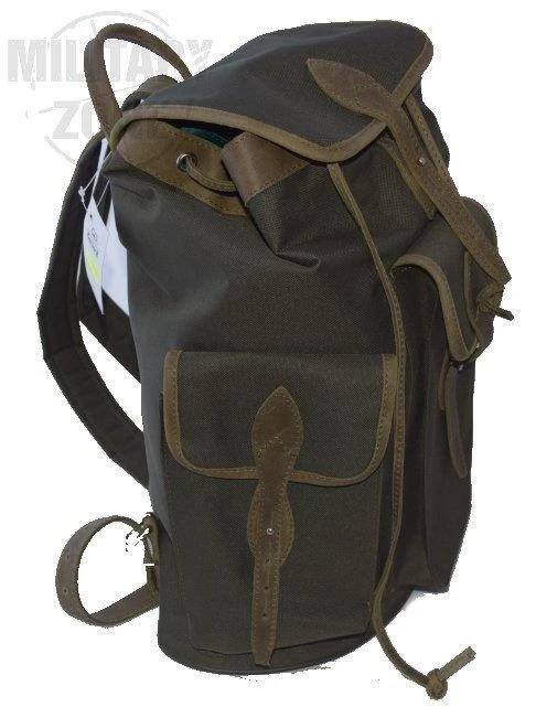 Plecak myśliwski został wykonany z brezentu lnianego w kolorze oliwkowym. Wykończenia ze skóry. Plecak posiada jedną główną komorę oraz trzy kieszenie mniejsze naszyte na zewnątrz plecaka. Kieszenie są zapinane za pomocą skórzanych pasków zapinanych na nitowane knopiki. Takie rozwiązanie sprawia że korzystanie z niego nie powoduje hałasu. Główna przegroda posada wkładkę z kolei to rozwiązanie pozwala nam na czyszczenie wnętrza plecaka bez konieczności prania całości. Wkładka może też nam posłużyć za dodatkowy worek w razie potrzeby. Całość jest zaciskana za pomocą cienkiego skórzanego paska. Plecak posiada regulację długości ramion.