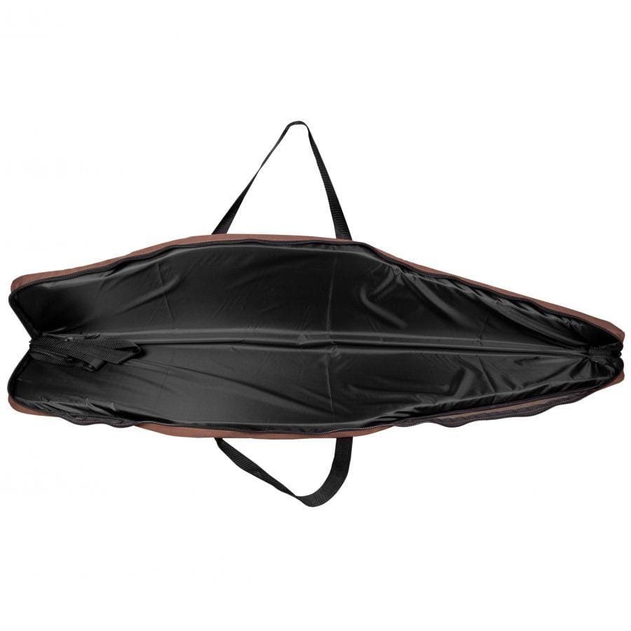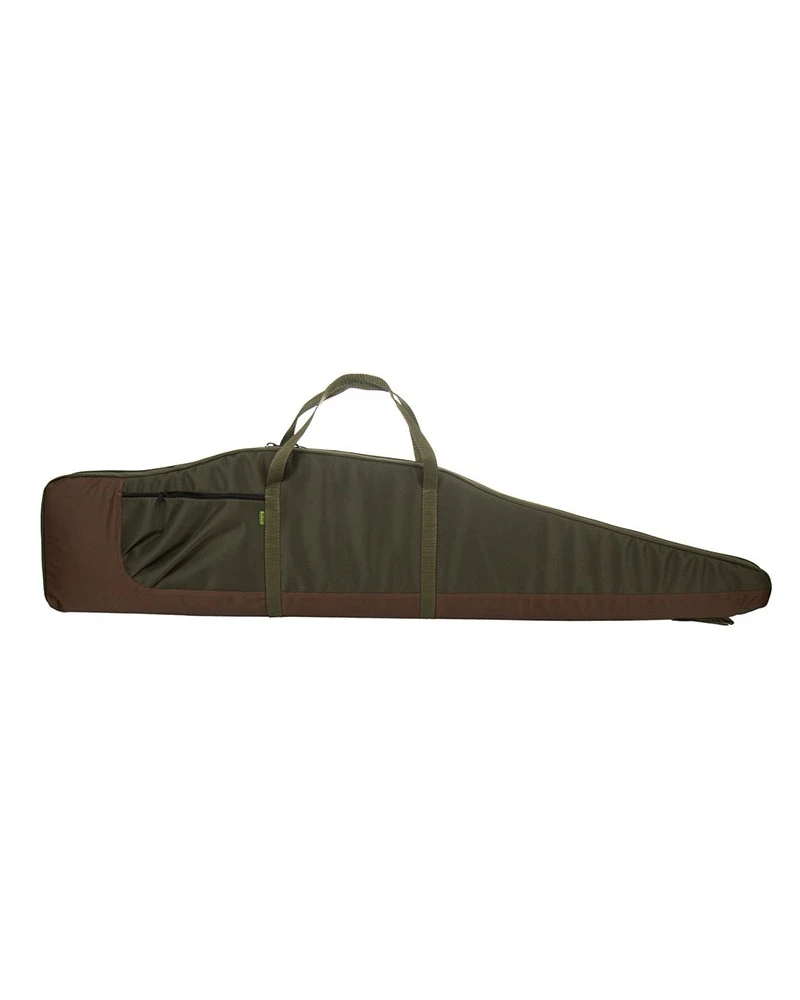 Pokrowiec na broń uszyty z zielono-brązowego nylonu, z boku kieszonka zapinana na zamek błyskawiczny, o góry ucho, dzięki któremu możemy powiesić pokrowiec wraz z bronią w pozycji pionowej.