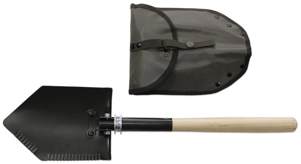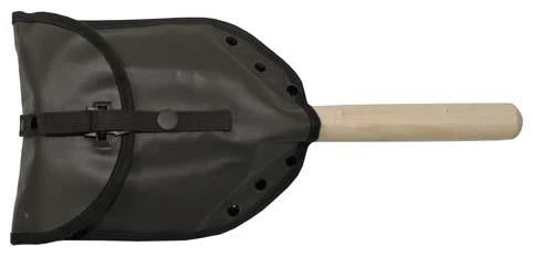 Drewniana rączka umożliwia pewny chwyt. Tę saperkę można złożyć w tzw. kopaczkę, łatwość zmiany pozycji umożliwia sprężyna wbudowana w miejscu łamania łopaty.