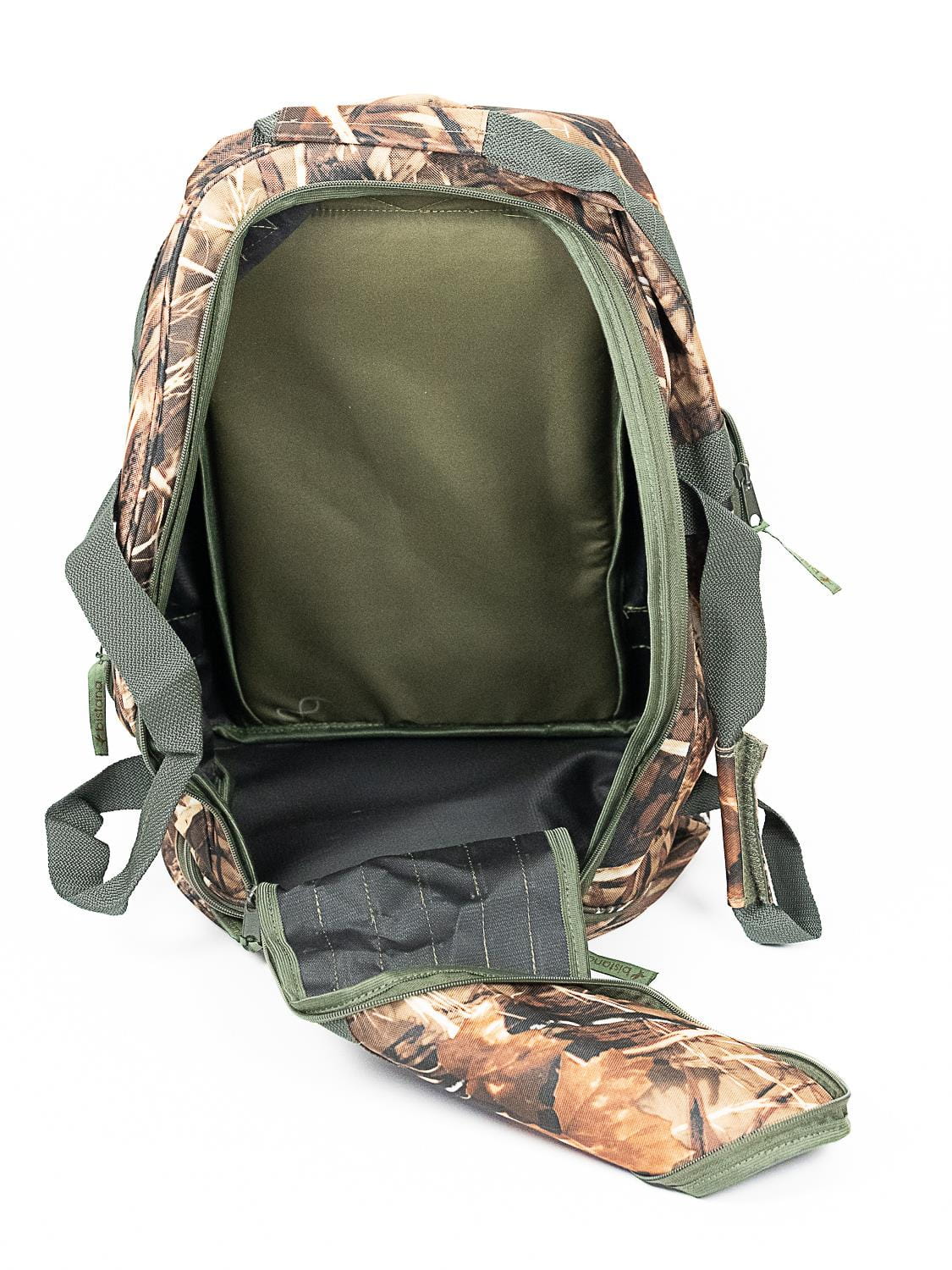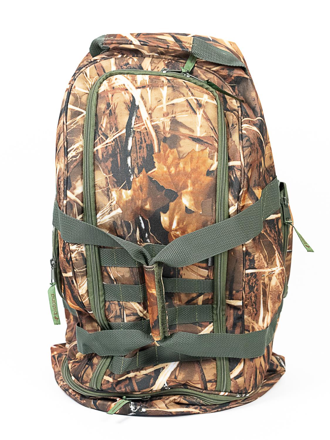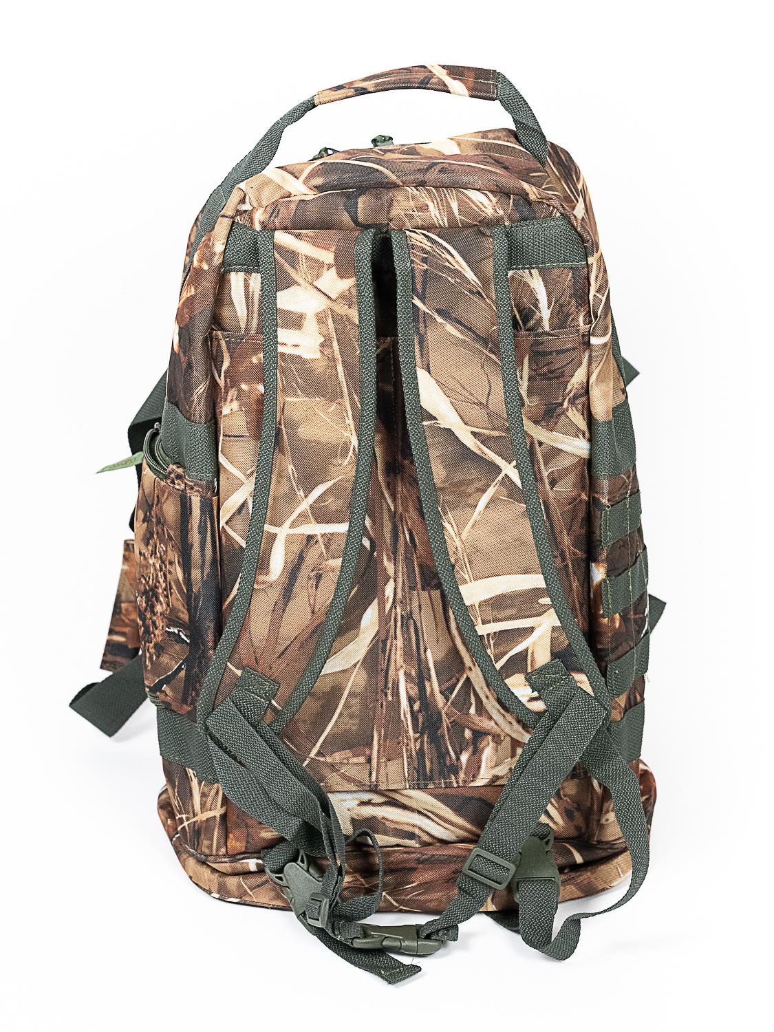 Torbo-plecak myśliwski we wzorze imitującym naturalne trzciny, liście i gałęzie.