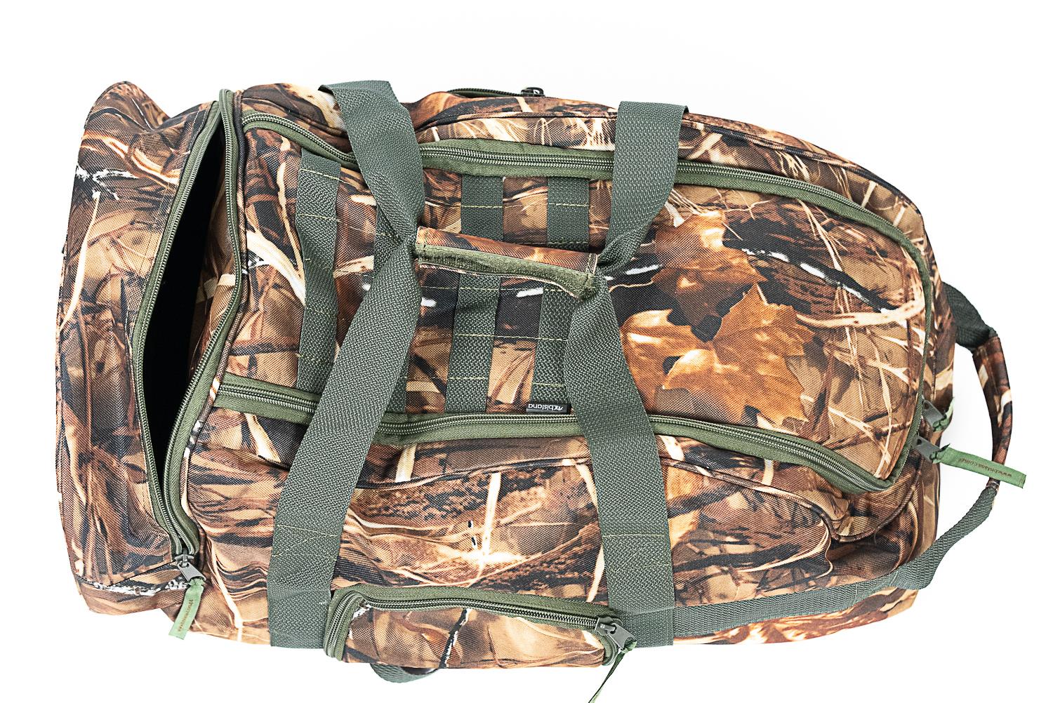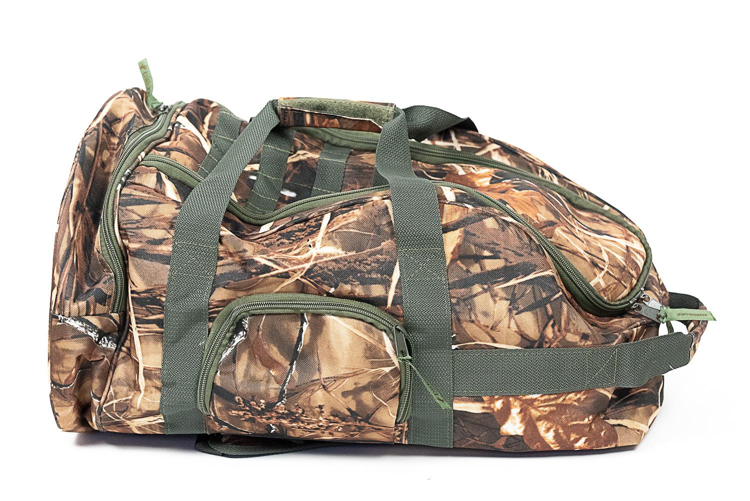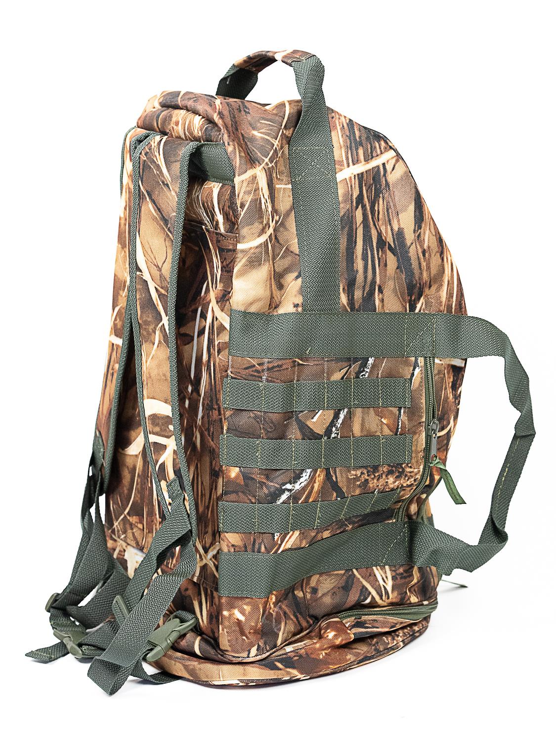Torbo-plecak myśliwski we wzorze imitującym naturalne trzciny, liście i gałęzie.