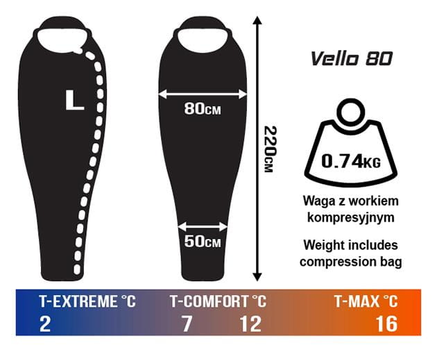 Śpiwór dedykowany osobom praworęcznym, zamek po lewej stronie ułatwia użytkowanie.