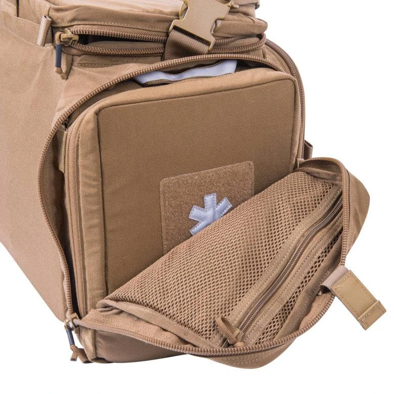 - Boki – całkowicie otwierane, wykończone w środku również systemem Versatile Insert System . Umożliwia to dopasowanie do naszych potrzeb torby za pomocą zasobników, ładownic etc.. (Jedna z kieszeni bocznych przeznaczona jest na zestaw medyczny (Automotiv Med Kit®)