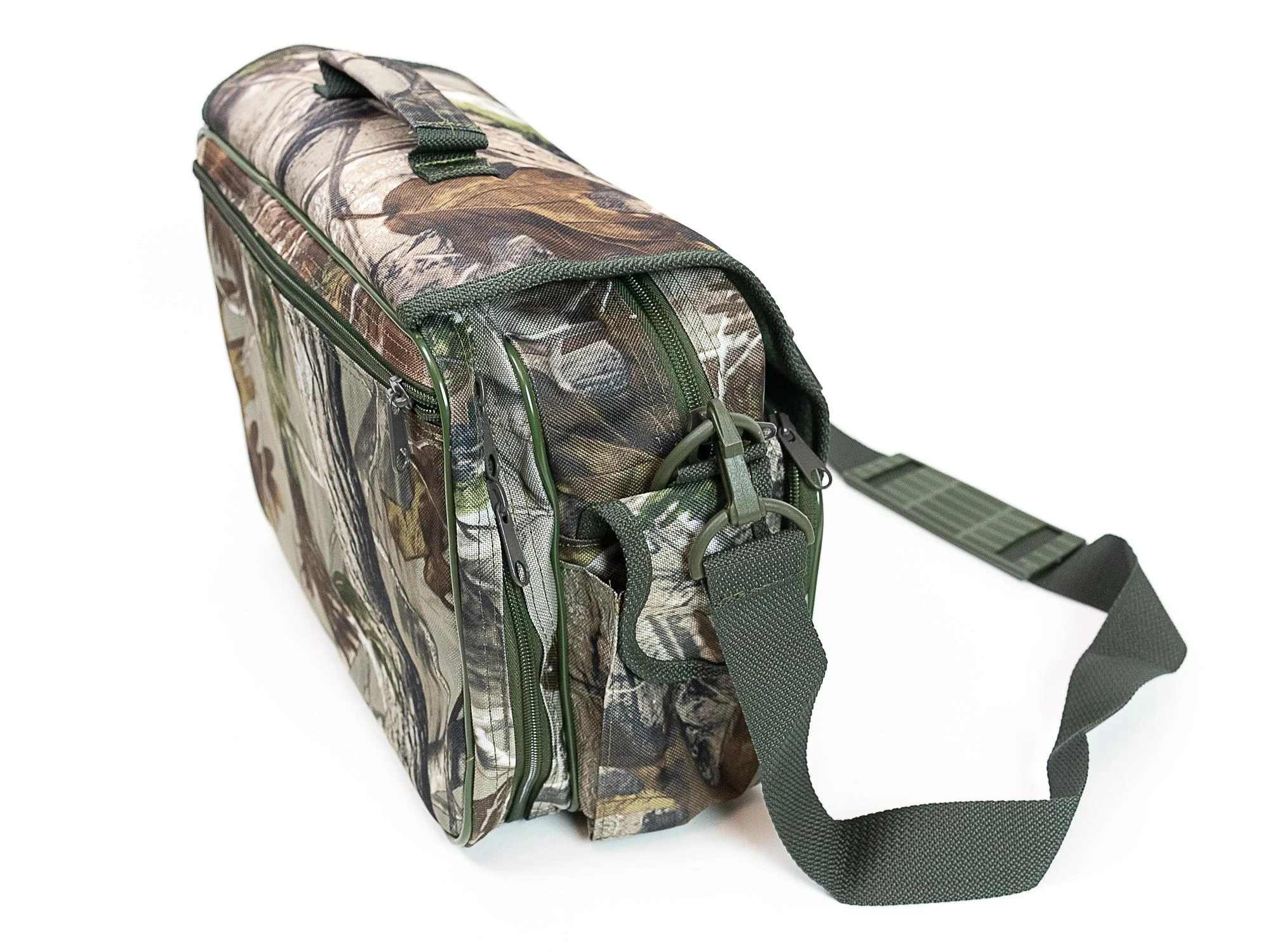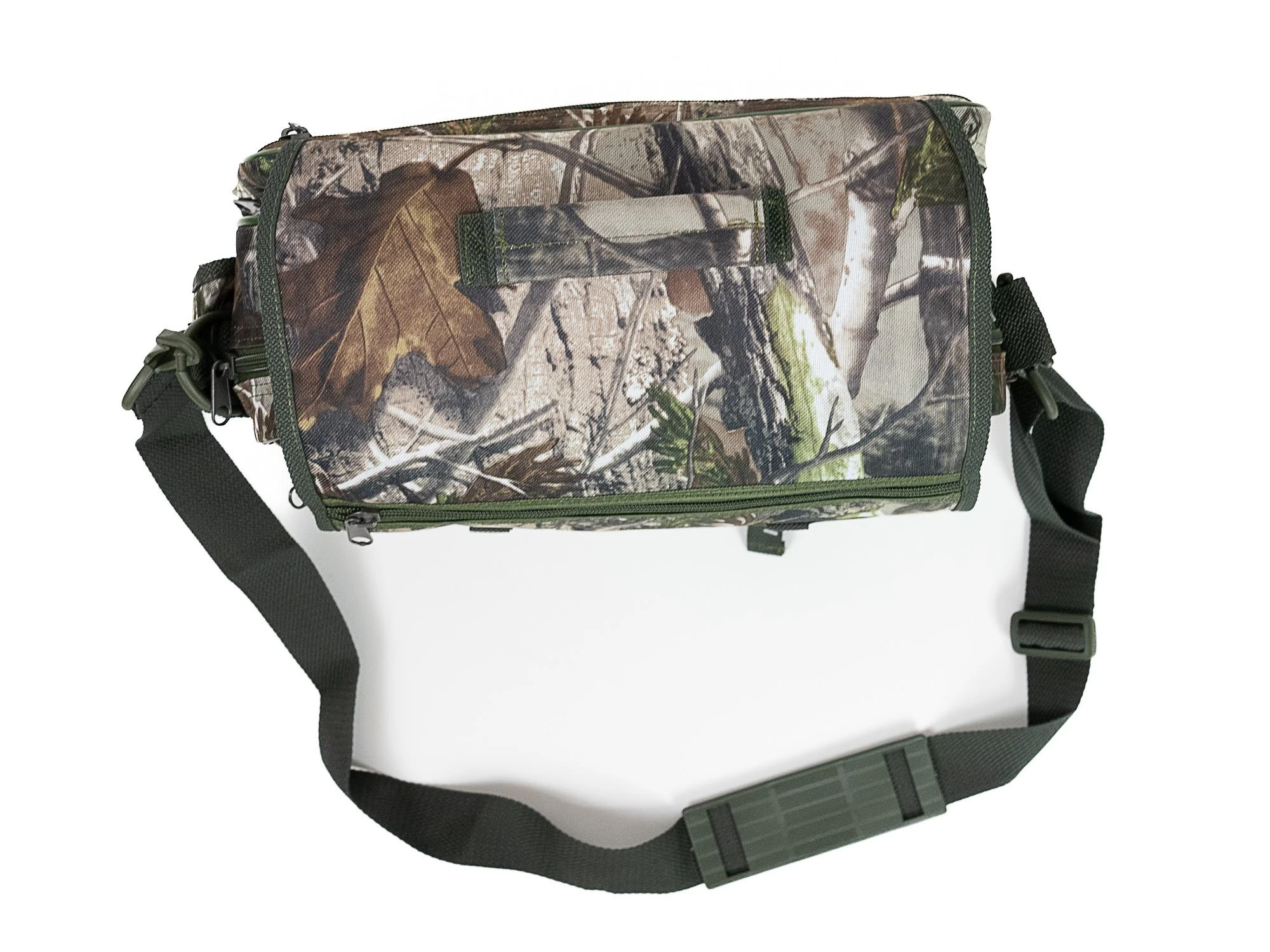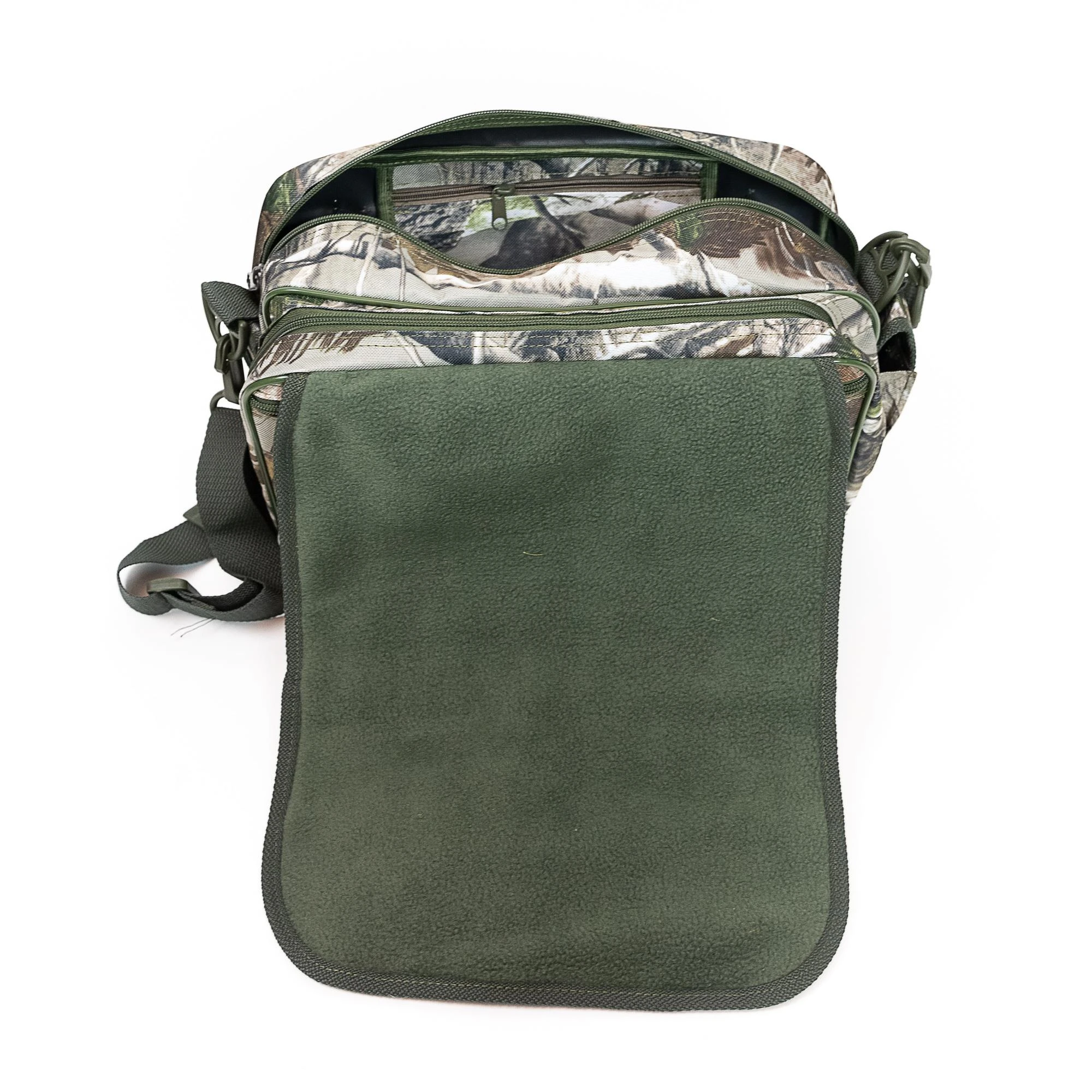 Torba myśliwska Rys to sztywna raportówka w kamuflażu real tree. Klapa torby jest także siedziskiem, wyściełanym miłym polarem.