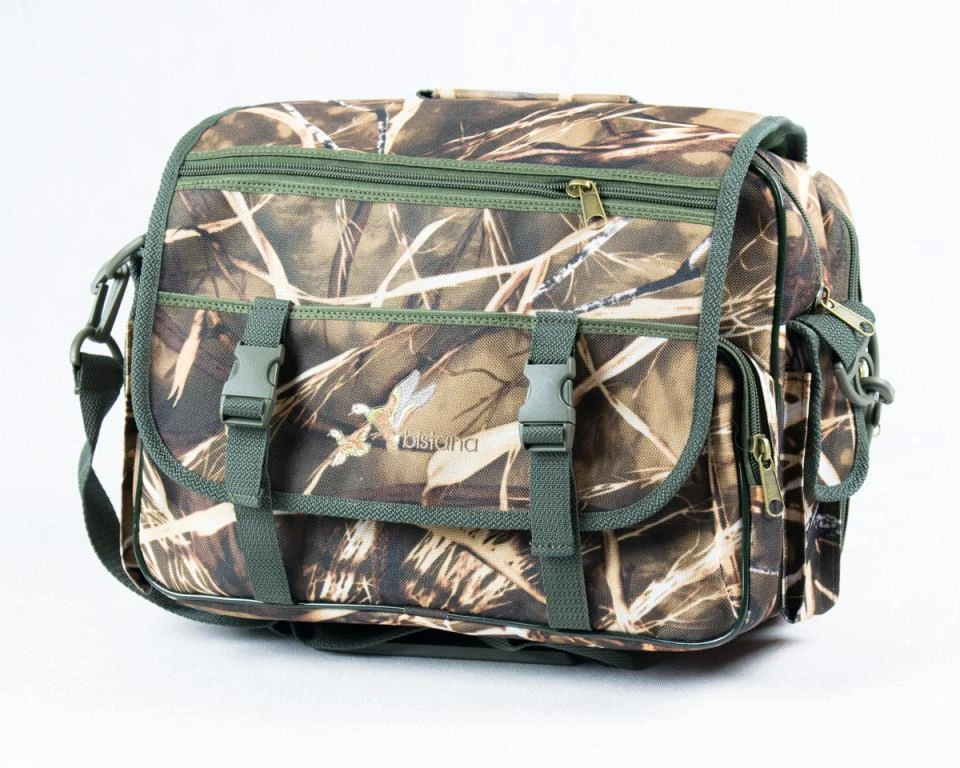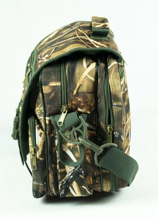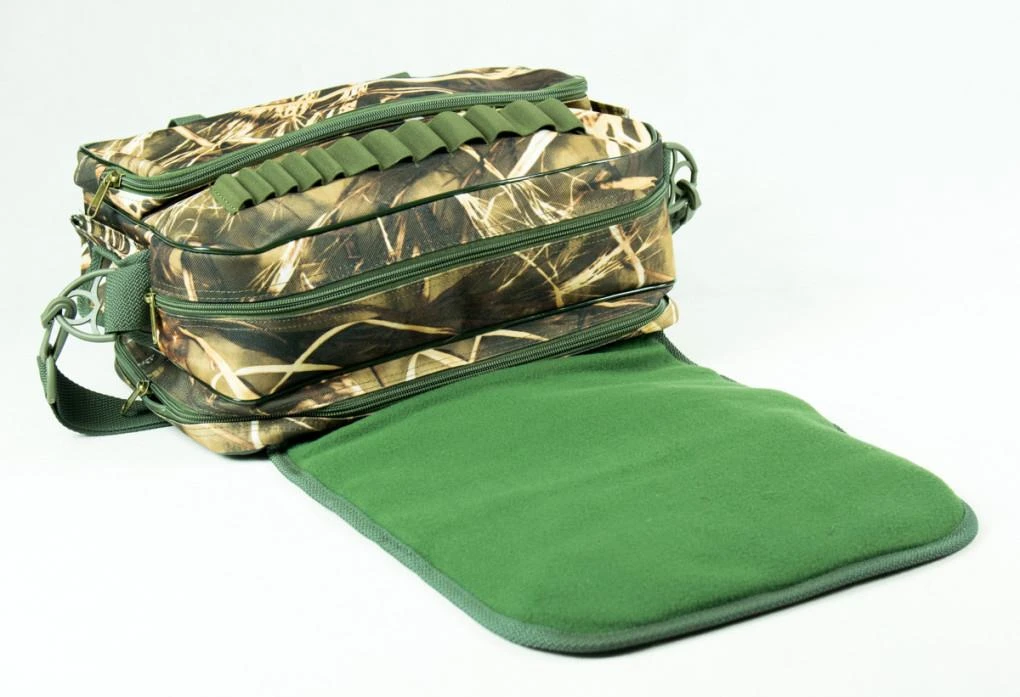 Torba myśliwska Rys to sztywna raportówka w kamuflażu real tree. Klapa torby jest także siedziskiem, wyściełnym miłym polarem . Z przodu klapy znajduje się równierz płaska kieszonka, a cała klapa zapinana jest na dwie klamry. Oprócz tego Torba posiada komorę głowną z dyskretną kiesonką na np dokumenty, mniejszą,węższą komorę, ładownicę oraz dwie małe kieszonki po bokach torby zamykane na rzep.