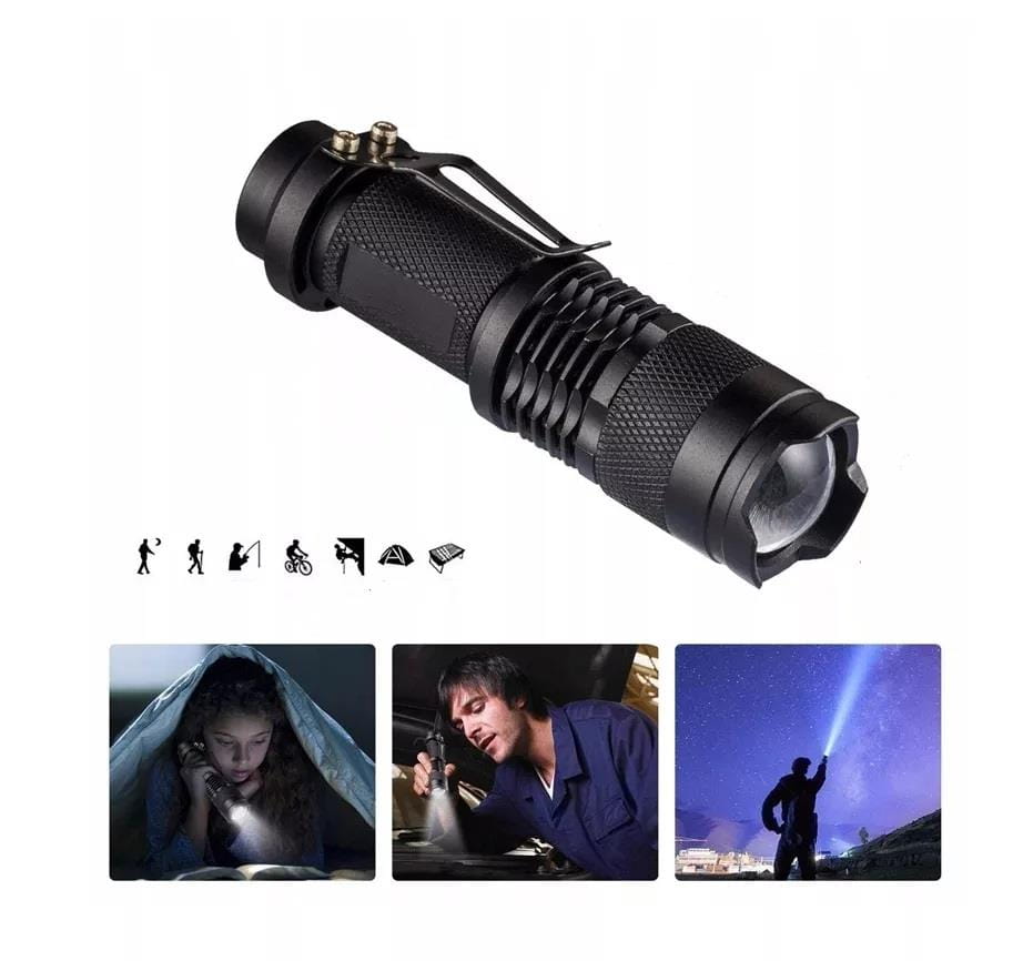 - Latarka taktyczna – metalowa latarka z klipsem umożliwiającym zaczepienie jej np. o kieszeń, plecak itp. Klips jest demontowalny.