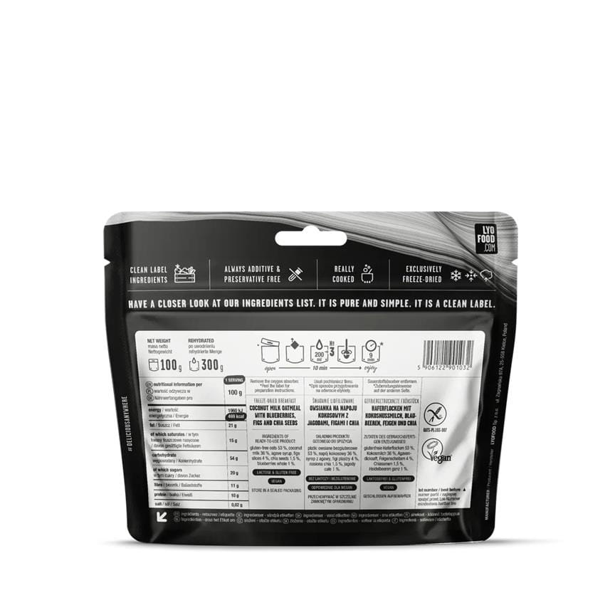To nie tylko ulubiona owsianka naszych klientów, ale także wybór ambasadorów – i zupełnie nas to nie dziwi! Bezglutenowe płatki owsiane gotowane w aksamitnym napoju kokosowym, wzbogacone górskimi jagodami, odżywczymi nasionami chia i subtelną słodyczą syropu z agawy to doskonały sposób na rozpoczęcie dnia. Smaku i wartości odżywczych dopełniają apetyczne plastry fig. Niezależnie od tego, czy wybierasz się na górską wyprawę, czy masz przed sobą wymagający dzień w mieście, to śniadanie dostarczy Ci energii na każdą przygodę!Posiłki LYO Food są gotowane przed liofilizacją. Nie zawierają sztucznych dodatków, cukru ani konserwantów.